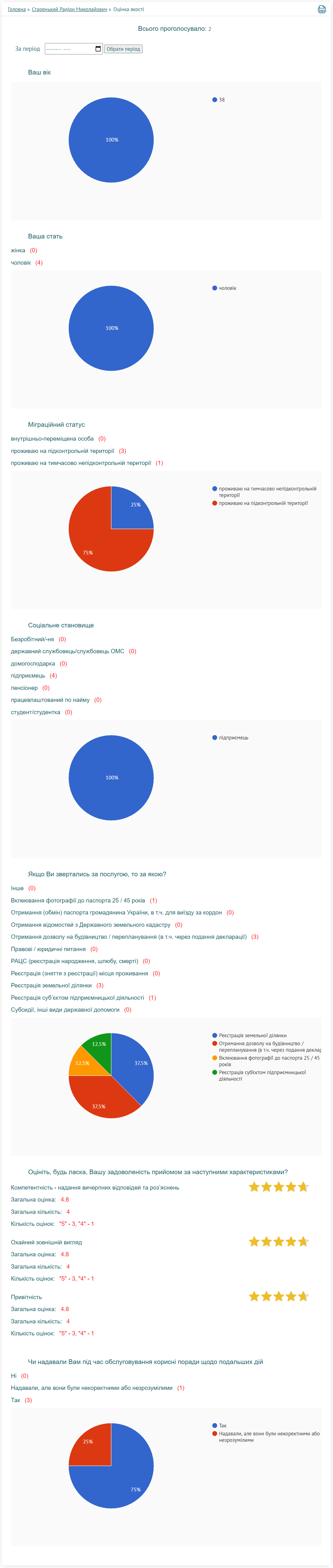 3. Assessment of the quality of service provision. A system for assessing the quality of service provision using a survey with flexible form settings, filters and statistics.
