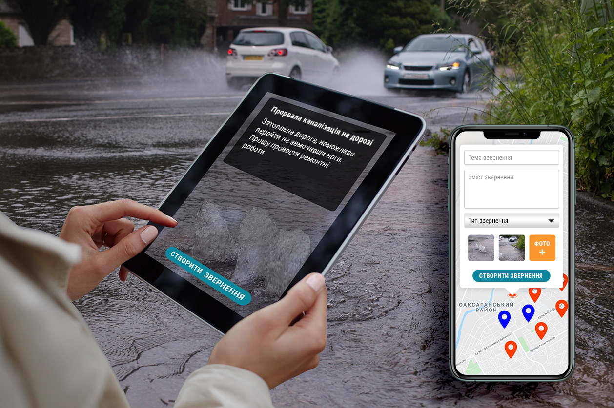 - Геолокаційні маркери звернень створюються на Google мапі в мобільному додатку (Android та iOS) або на сайті (можна як вручну вказати місцезнаходження проблеми на мапі, так і через функцію «Моє місцезнаходження») та відображаються на загальній мапі після підтвердження менеджера (премодерація)