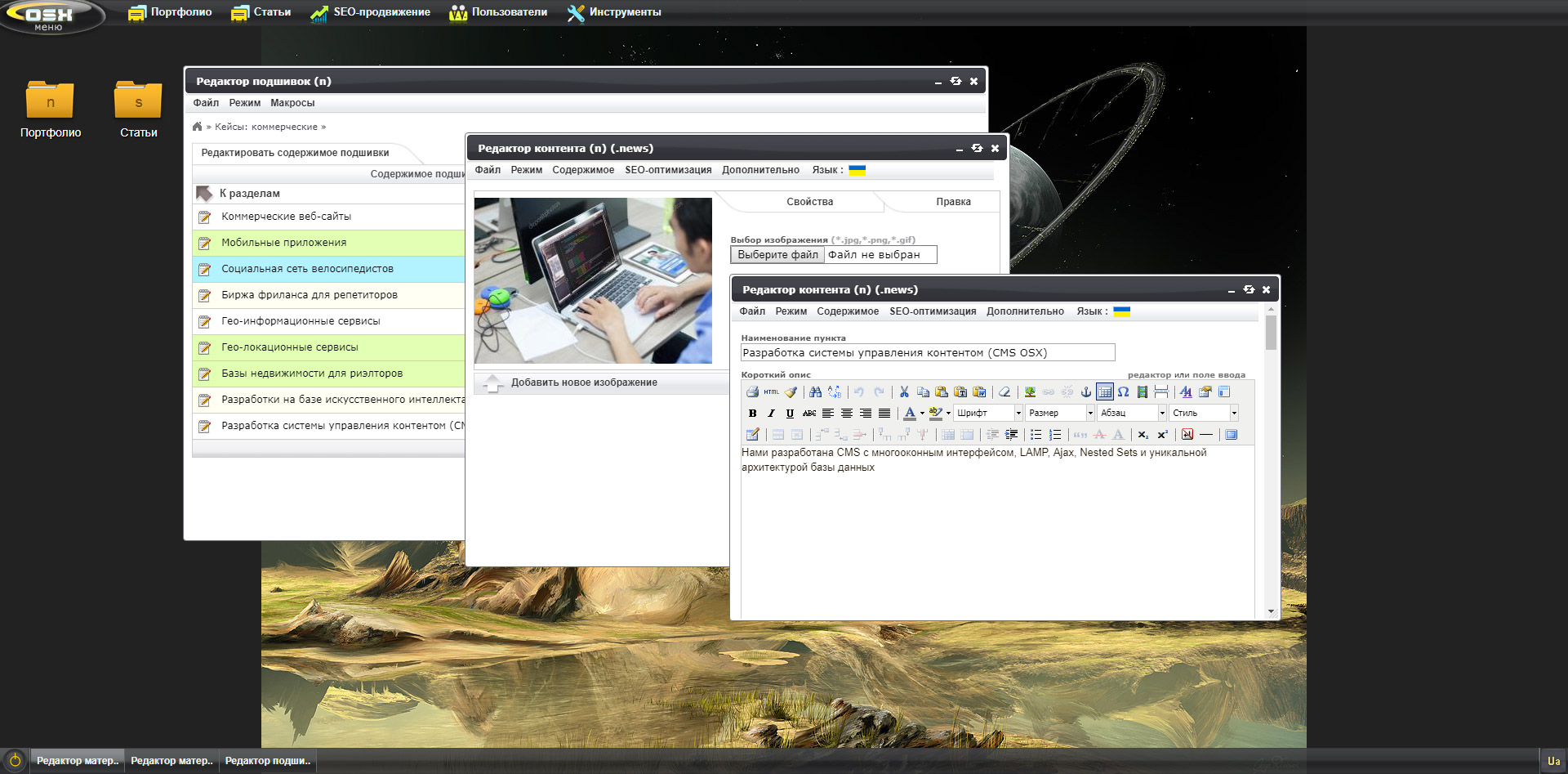 Нами розроблена CMS з багатовіконний інтерфейс, LAMP, Ajax, Nested Sets і унікальною архітектурою бази даних