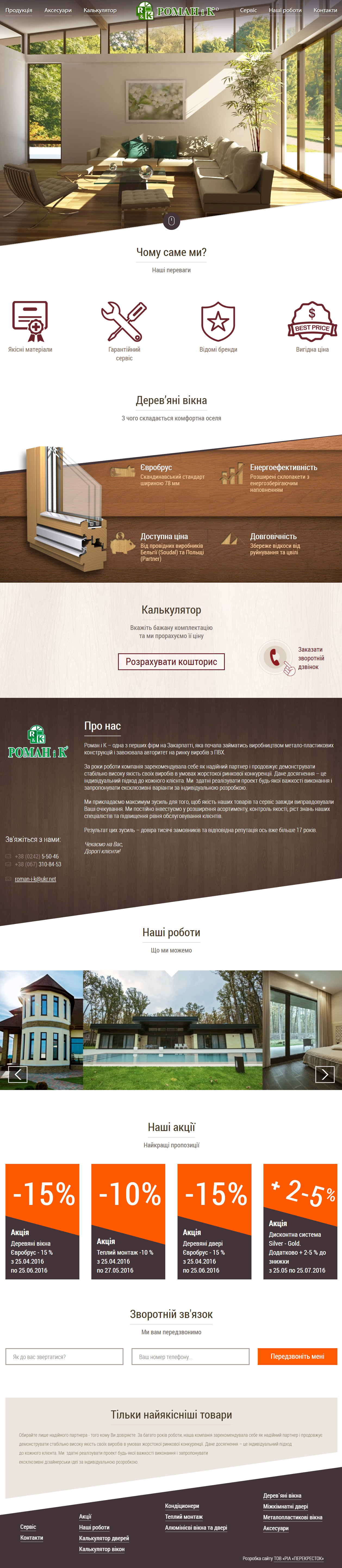 Веб-сайт в сучасному індивідуальному стилі, адаптований під мобільні пристрої. Цікавою особливістю сайту є покроковий калькулятор метало-пластикових вікон і дверей з взаємозалежними полями і оформленням замовлення на другому кроці.